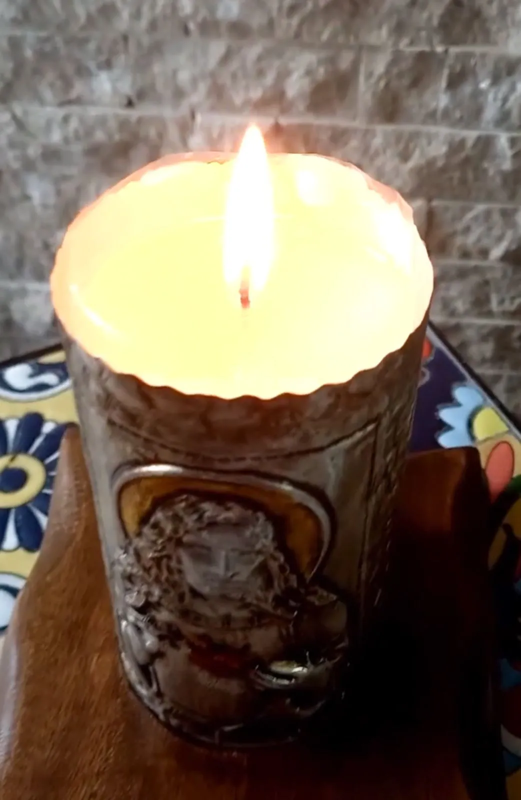 Cirio con la imagen de la sagrada familia  decorada con láminas de aluminio, repujado, pintado y envejecido totalmente a mano.