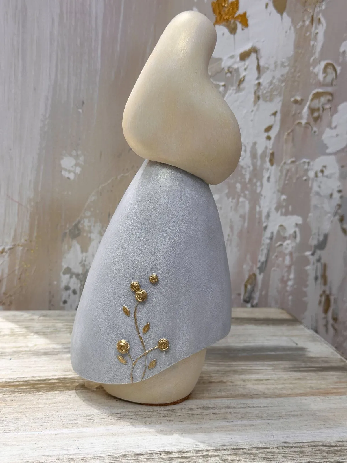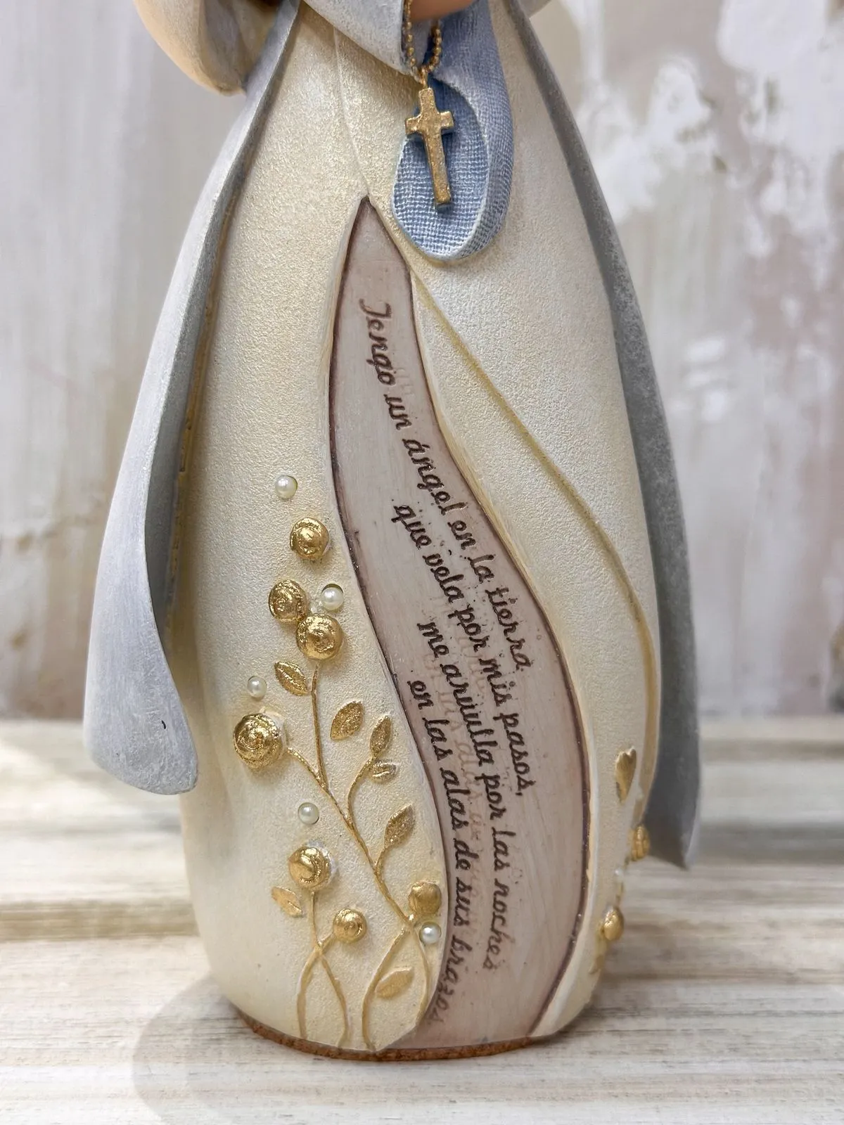 Su vestido en tonos suaves, adornado con flores doradas en relieve y palabras de oración grabadas, convierte esta pieza en un tesoro para el alma y para el hogar.