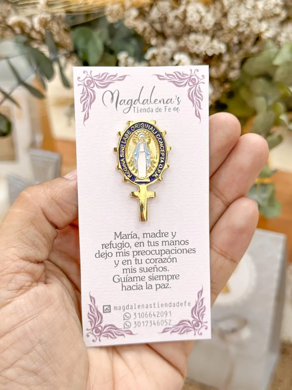 Pines Virgen Medalla Milagrosa. Se envían con la presentación de la foto. Se personaliza la estampa desde 12 unidades.