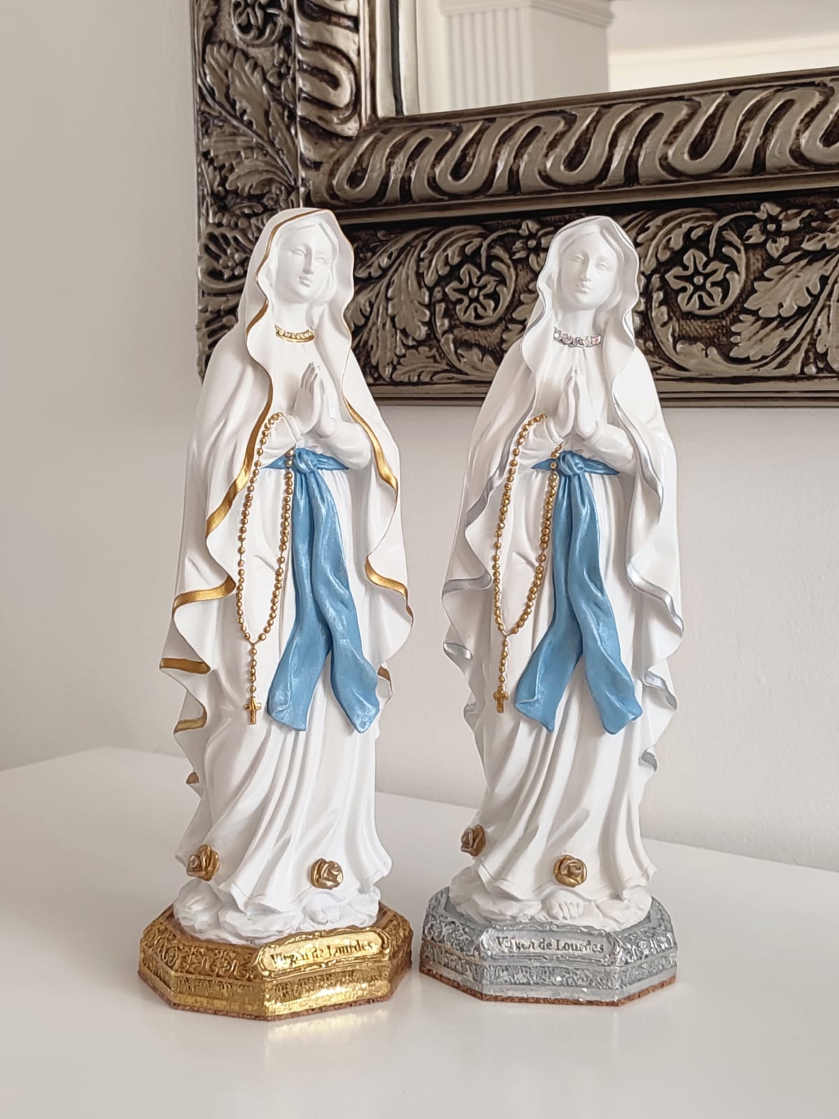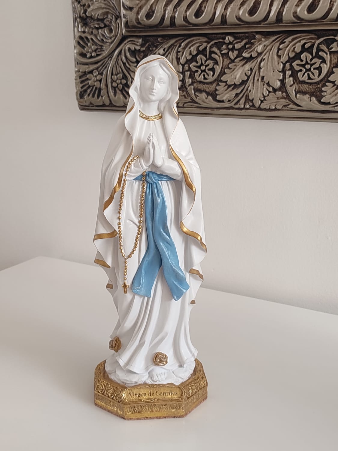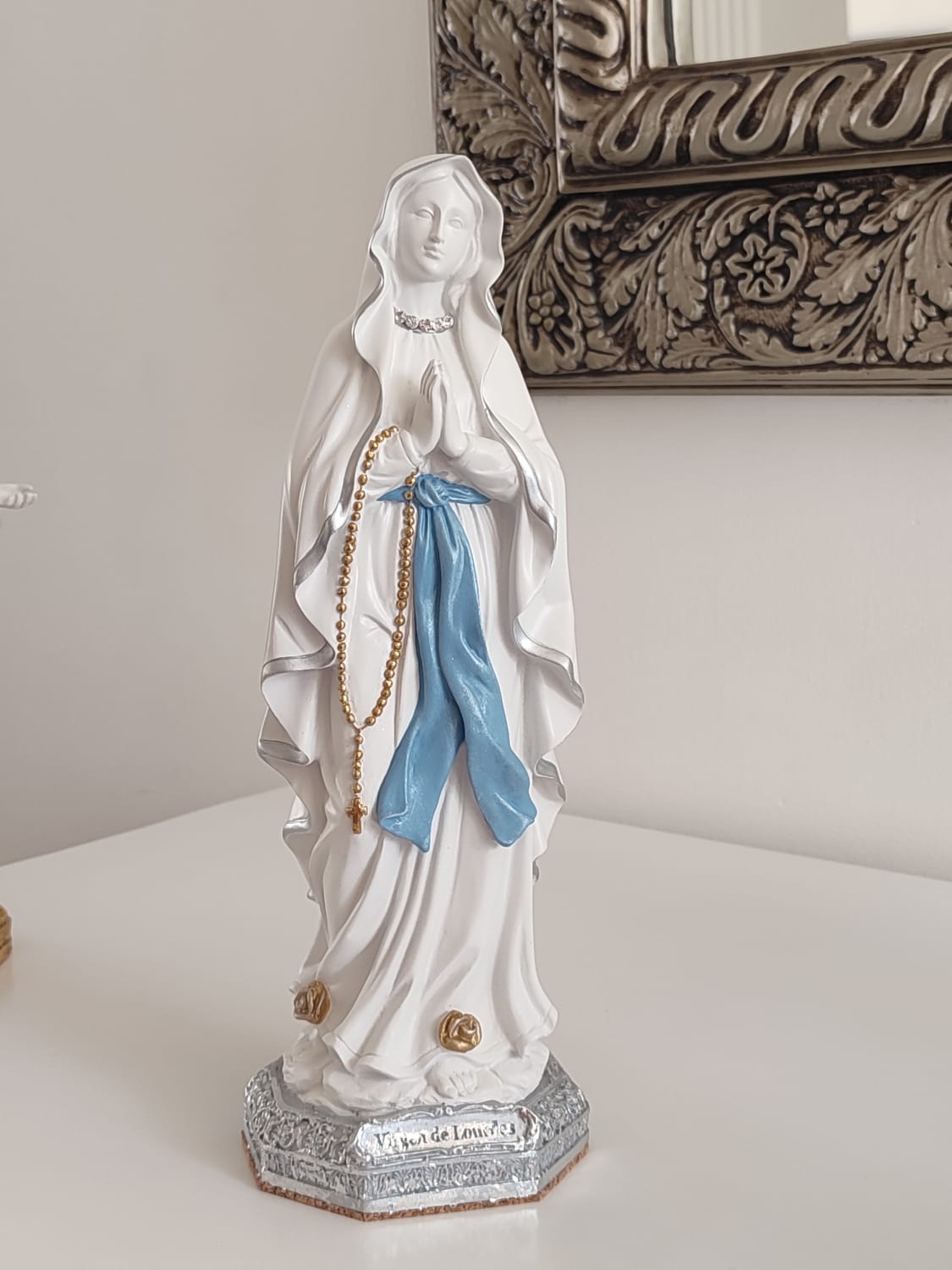 Elaborada  en marmolina, material ideal para poner en interiores y exteriores, se entrega empacada para regalo,  incluye estampa de la marca y denario para las manitos de la virgen.